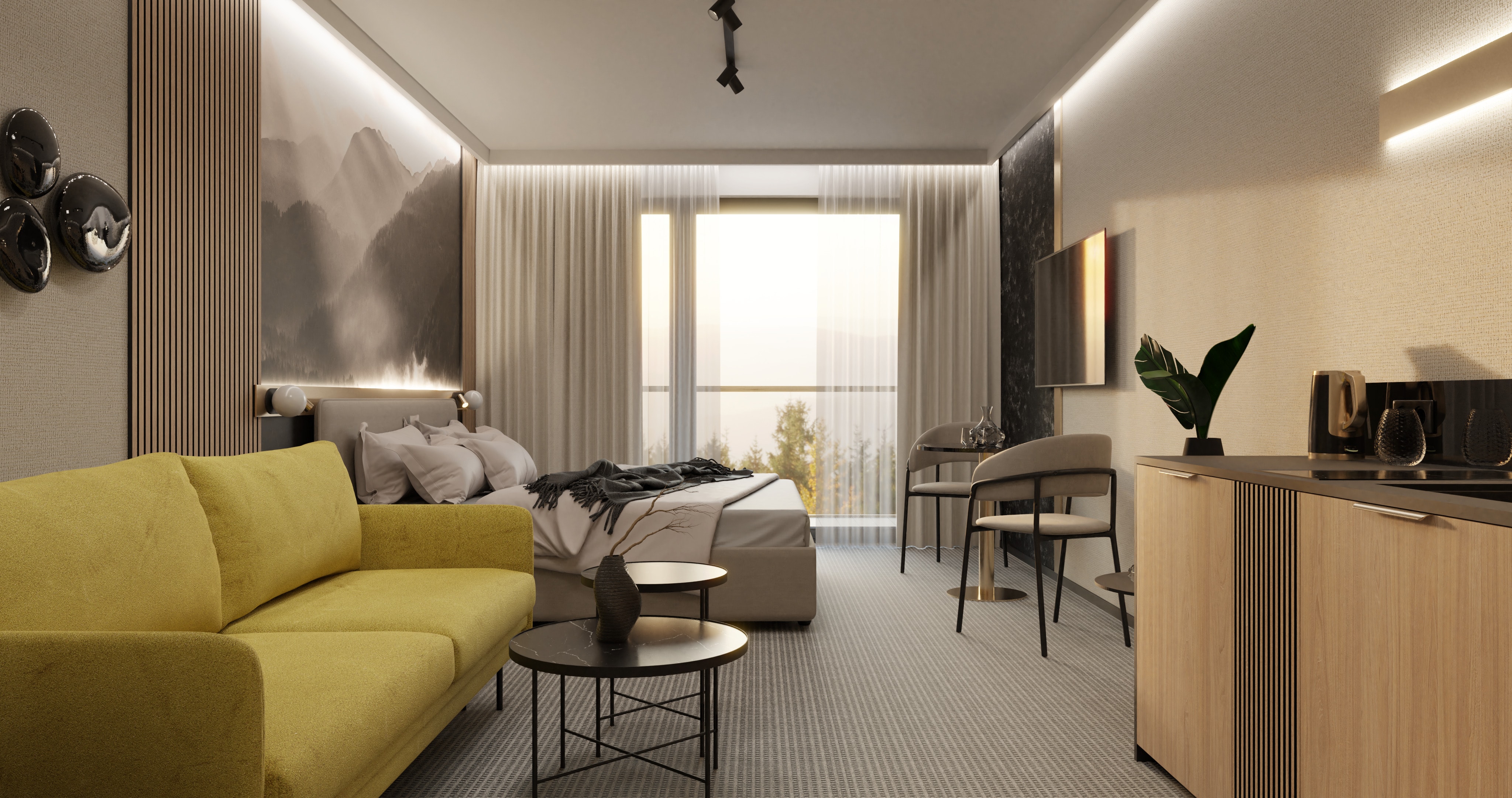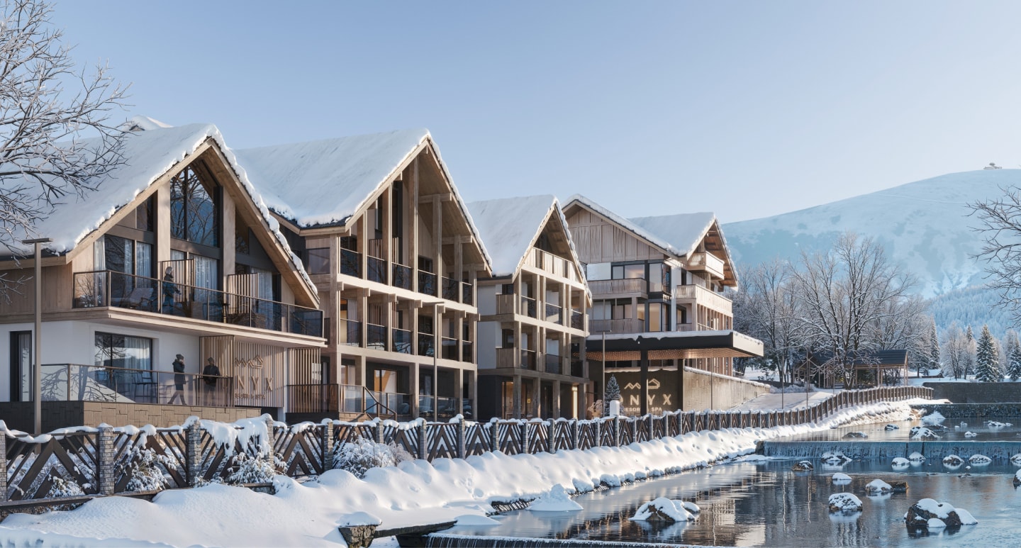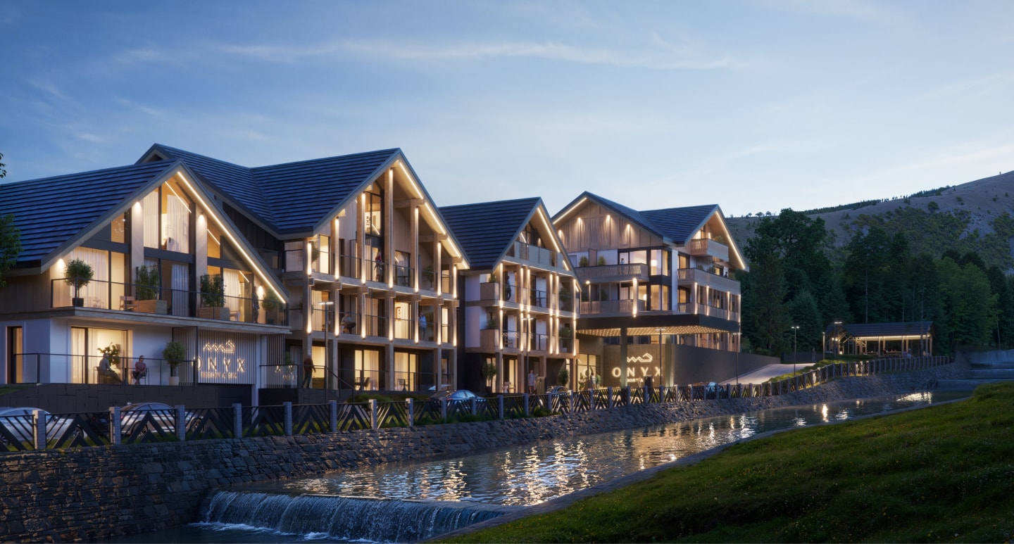 Inwestycja Onyx resort & spa zaprojektowana została przez architektów tak, aby stworzyć niepowtarzalny obiekt dla najbardziej wymagających. Onyx to kamień o głębokim, matowym wykończeniu, który symbolizuje siłę, stabilność i luksus. To nawiązanie do wysokiej jakości i dbałości o detale naszej inwestycji. Nowoczesna architektura wpisana w otoczenie rzeki i gór.